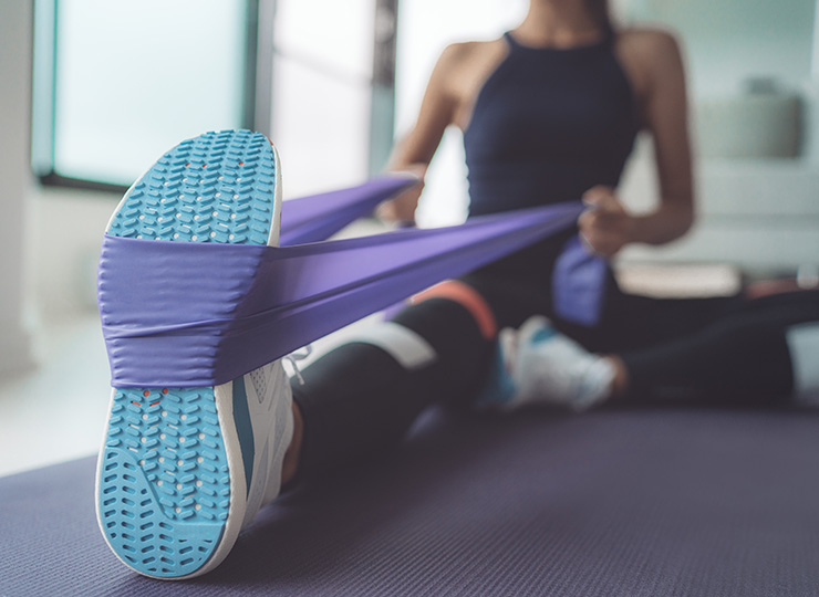 - Sit tall with legs extended, resistance band looped around your feet
